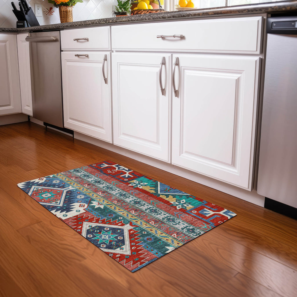 Bring a touch of bohemian elegance to your floors with our Aztec-inspired area rug, featuring a transitional design that complements any decor. The vivid motifs add a distinctive charm to your living space, crafted to thrive both indoors and outdoors with UV stabilization. The ultra-thin design allows for effortless placement and layering, while the convenience of being machine-washable ensures easy care. Perfect for homes with pets and children, this rug combines practicality with artisanal style.