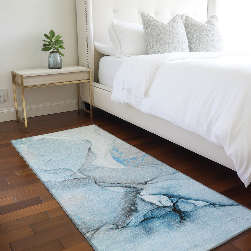 Bring a tranquil atmosphere into your space with our transitional area rug, crafted with alcohol ink-inspired effects and watercolor aesthetics. This UV-stabilized rug is perfect for indoor or outdoor use and features an ultra-thin construction with an incorporated non-skid backing, removing the need for a separate rug pad. Its machine-washable and family and pet-friendly nature makes upkeep easy.