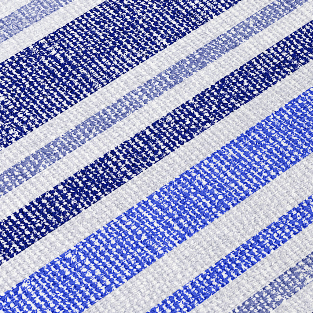 Elevate the style of your room with our area rug, boasting stripes that offer complementing colors to catch the eye and add energy to the space. This transitional striped rug seamlessly integrates into any decor. It is UV stabilized for indoor or outdoor use, and its ultra-thin construction with an incorporated non-skid backing ensures stability without the need for a separate rug pad. Machine-washable and family and pet-friendly, this rug combines practicality and versatility.